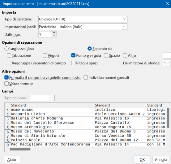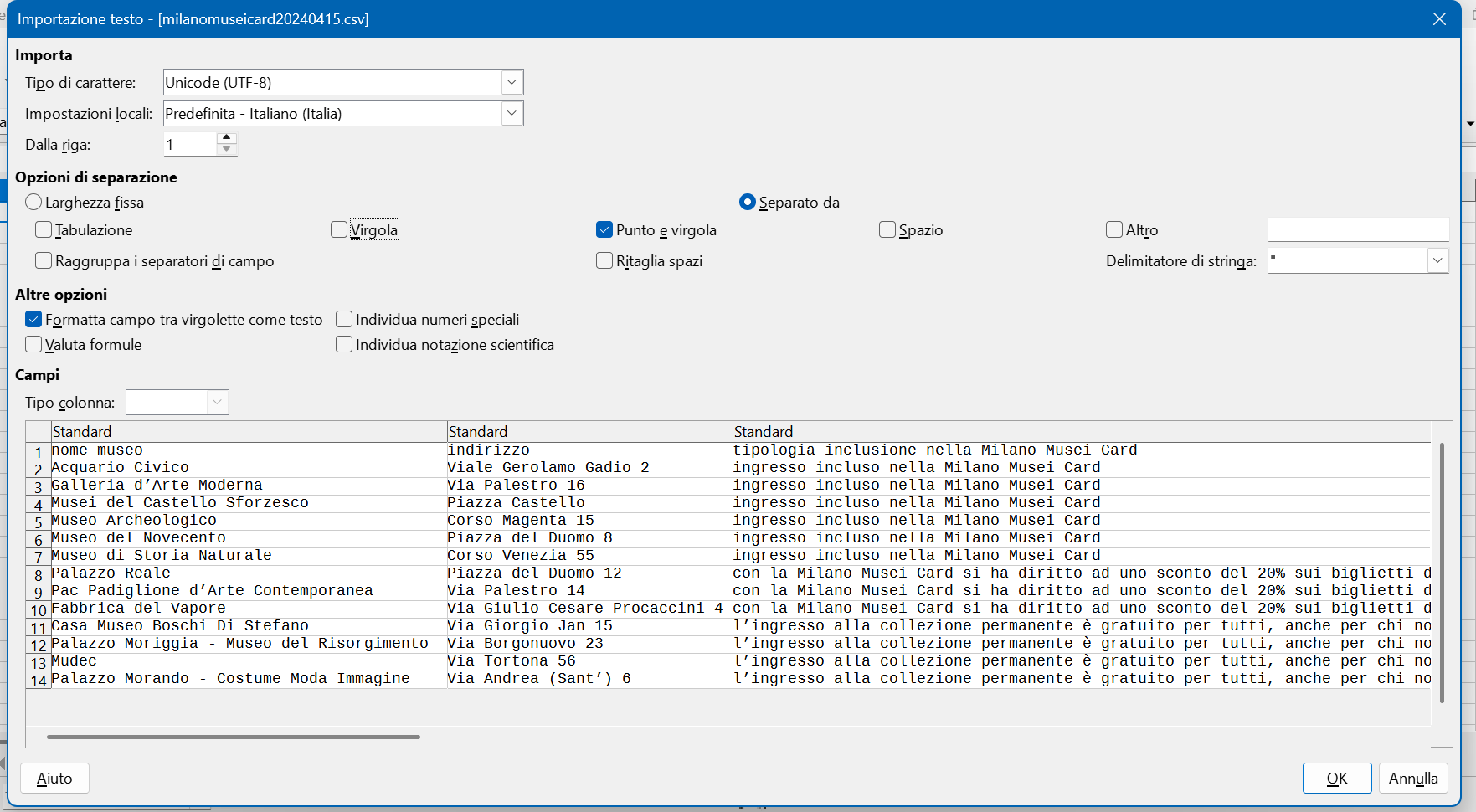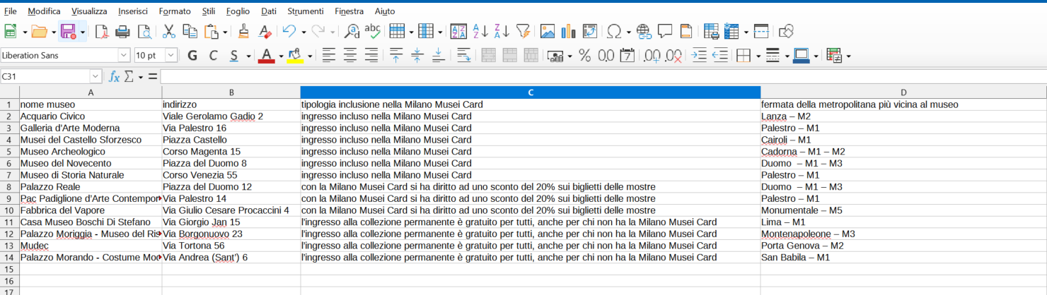 È importante notare che i due titoli delle colonne del dataset, ovvero “nome museo” e “indirizzo” in questo caso, sono semplici da comprendere.