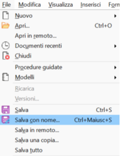 Dopo aver inserito i dati, clicca sul menù “File” 🡪 “Salva con nome”.