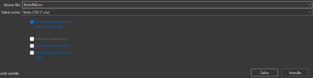 Dai un nome al file e seleziona “Testo CSV (*.csv)” nella casella “Salva come”: