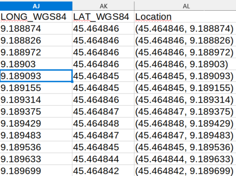 Nelle ultime tre colonne del dataset, “LONG_X_4326”, “LAT_Y_4326” e “Location”, sono presenti le coordinate geografiche del numero civico, che puoi copiare e incollare nel tuo file.