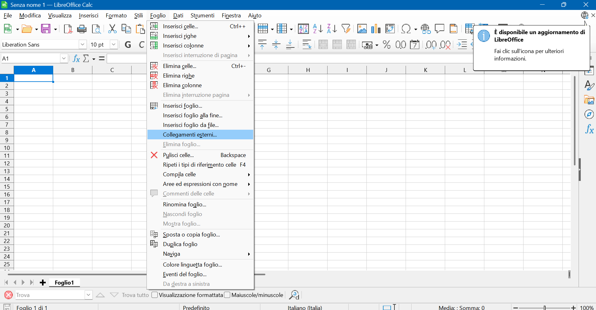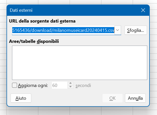 Dal menù in alto, clicca su “Foglio” 🡪 “Collegamenti esterni” per importare i dati di esempio.